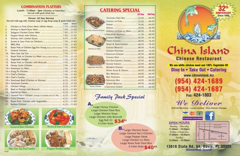 At China Island Restaurant, located at 13618 FL-84, Davie, FL 33325, the menu offers a delightful mix of classic Chinese dishes that cater to a variety of tastes and preferences. The Appetizers section starts with options like Vegetable Spring Roll and Chicken Fingers, both light and crispy starters, perfect for beginning your meal. For those who enjoy something a bit heartier, the Fried Wonton and Chicken Wings are great choices, with the Honey Garlic Chicken Wings providing a sweet and savory twist on the classic.